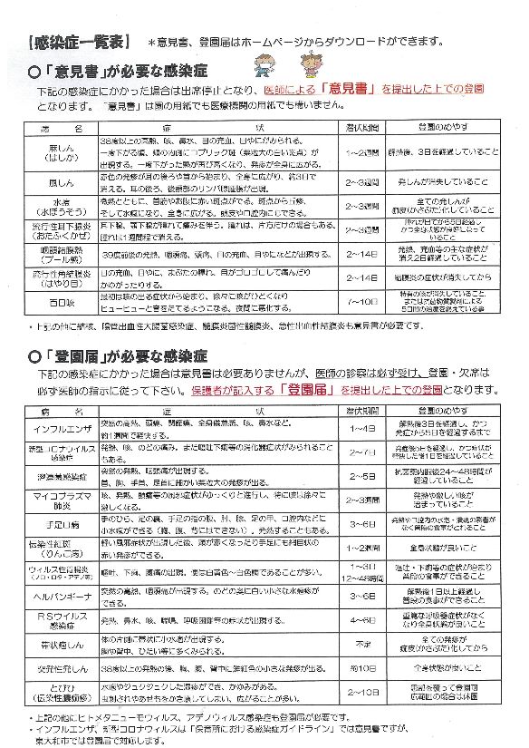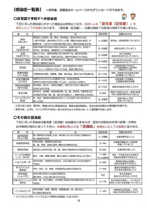 ページ後半にある「感染症の登園基準」をご覧下さい。